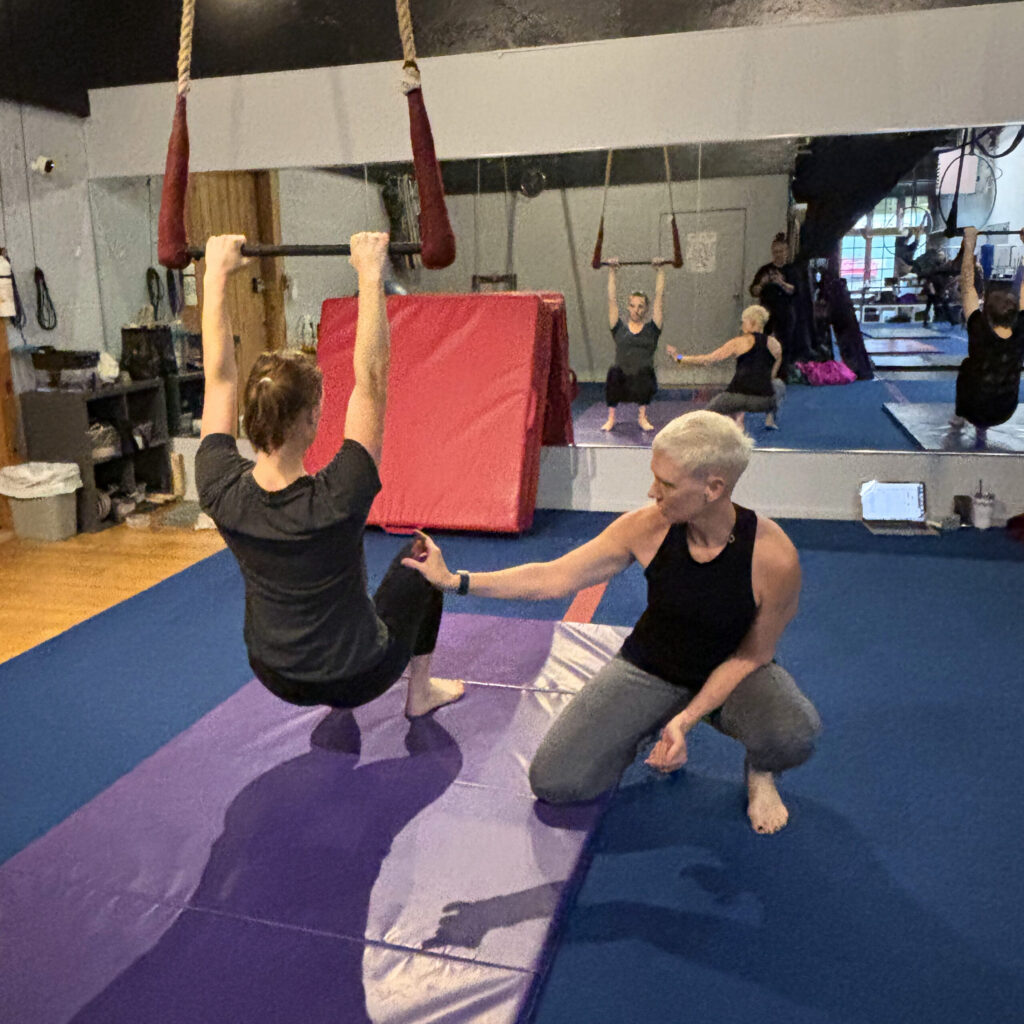 - Intro – This is for brand new students; no prior experience is needed. Vertical graduation requirements from this level are solid basic and Russian climbs, safe and stable descents, solid footlocks in the air, straddle up from the ground with the ability to hold the position once inverted, and the ability to get into a sling or knotted fabric via double knee hook or pullover. Trapeze/lyra graduation requirements are the ability to mount the bar and come to sitting, pullover to hip hang, and the ability to hold a front balance position.